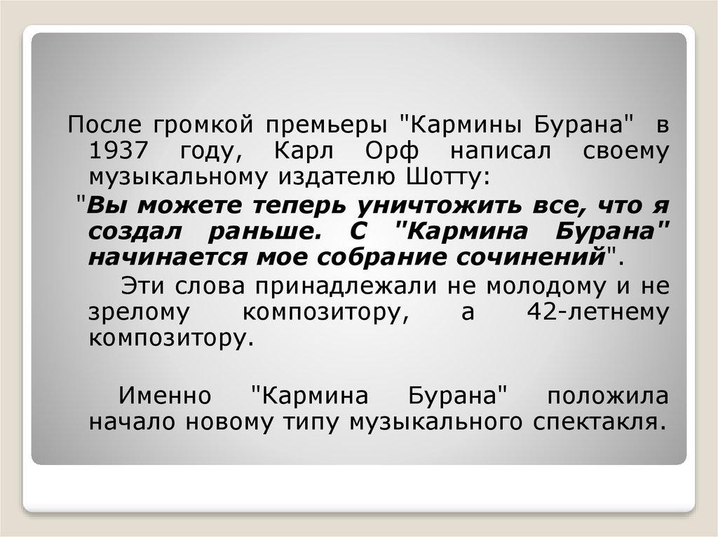 После громкой премьеры "Кармины Бурана" в1937 году, Карл Орф написал своему