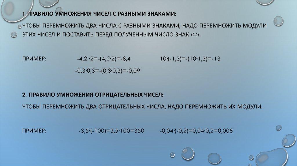 1.ПРАВИЛО УМНОЖЕНИЯ ЧИСЕЛ С РАЗНЫМИ ЗНАКАМИ:ЧТОБЫ ПЕРЕМНОЖИТЬ ДВА ЧИСЛА С РАЗНЫМИ ЗНАКАМИ, НАДО ПЕРЕМНОЖИТЬ МОДУЛИ