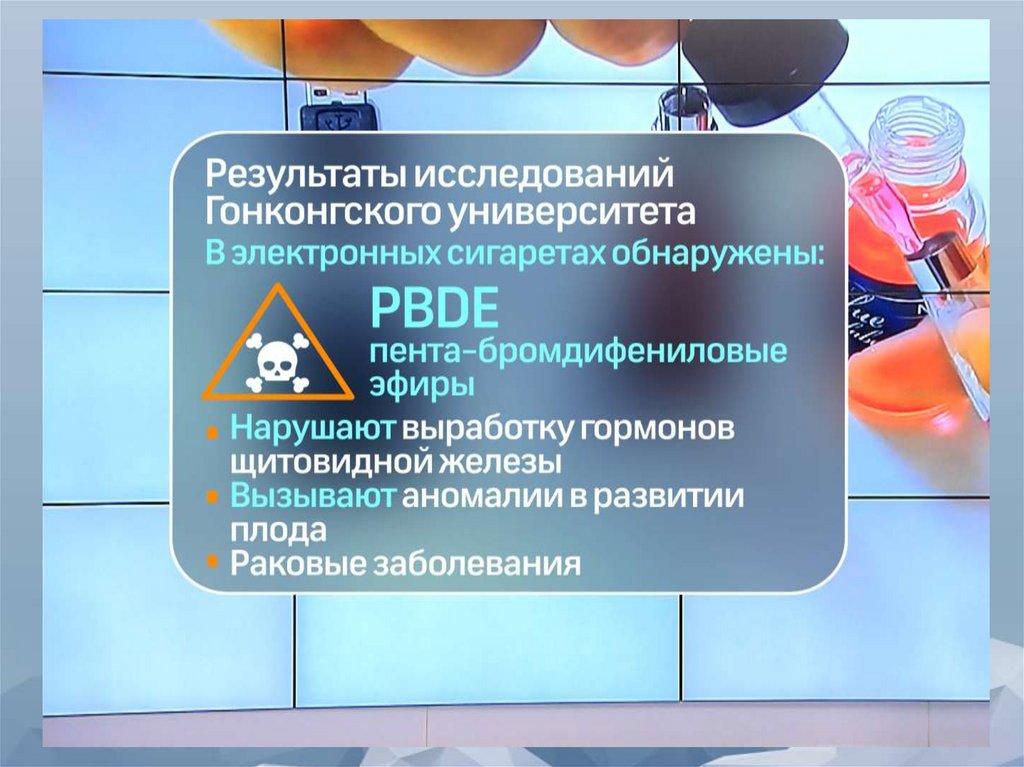 • Аэрозоли ЭС содержат высокотоксичный никотин и другиехимические токсины и концерогены (карболовые соединения,