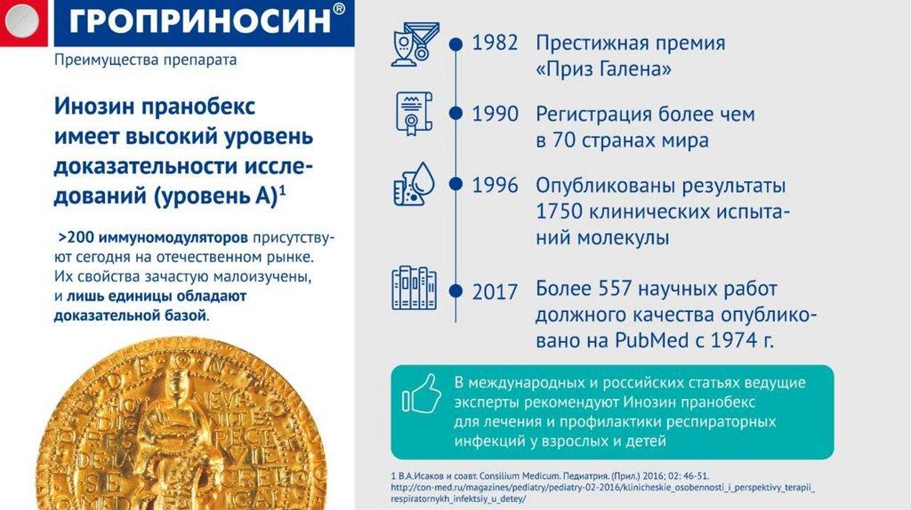 Елисеева М. Ю. и соавт. Эффективность вспомогательной иммунотерапии у пациентов с иммунодефицитом и часто болеющих детей: метанализ применения Гроприносина, 2010 г.