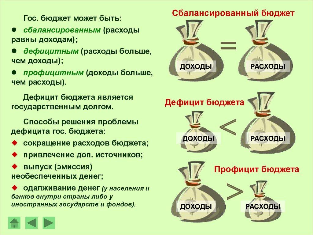 Гос. бюджет может быть:сбалансированным (расходы