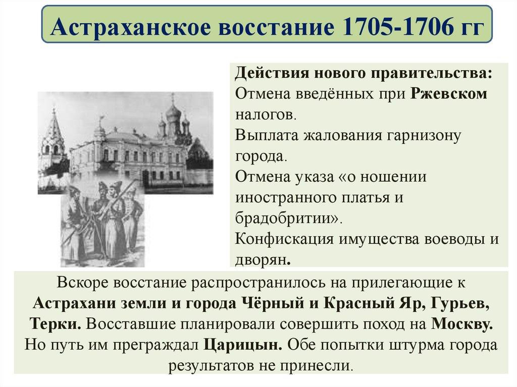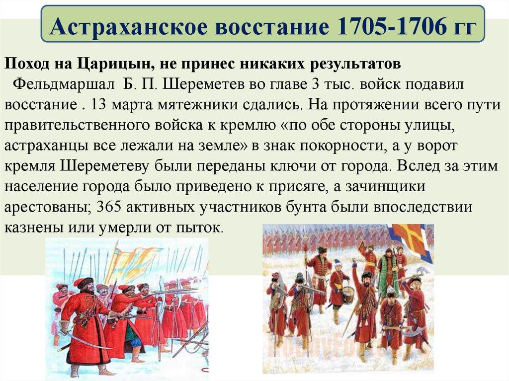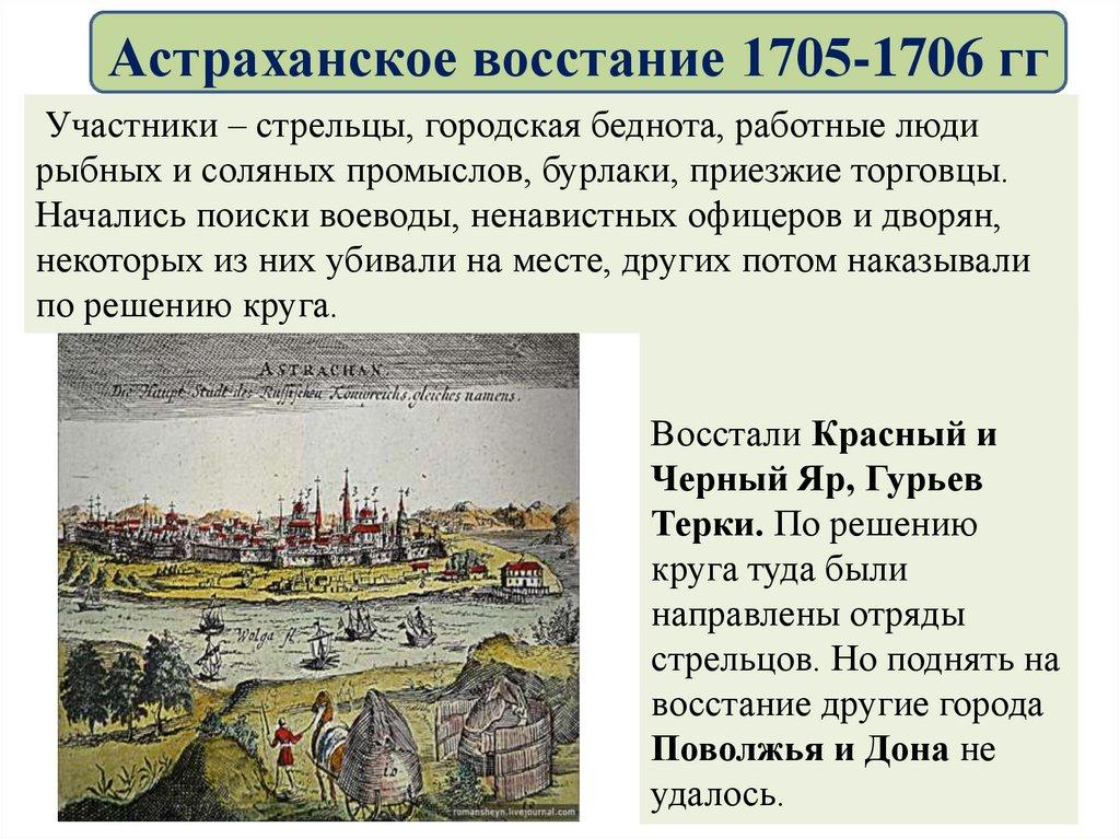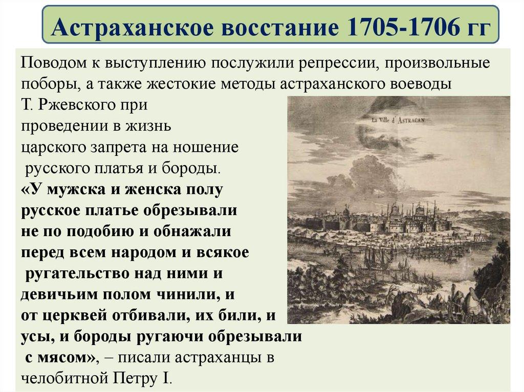 Астраханское восстание 1705-1706 ггПоводом к выступлению послужили репрессии, произвольные