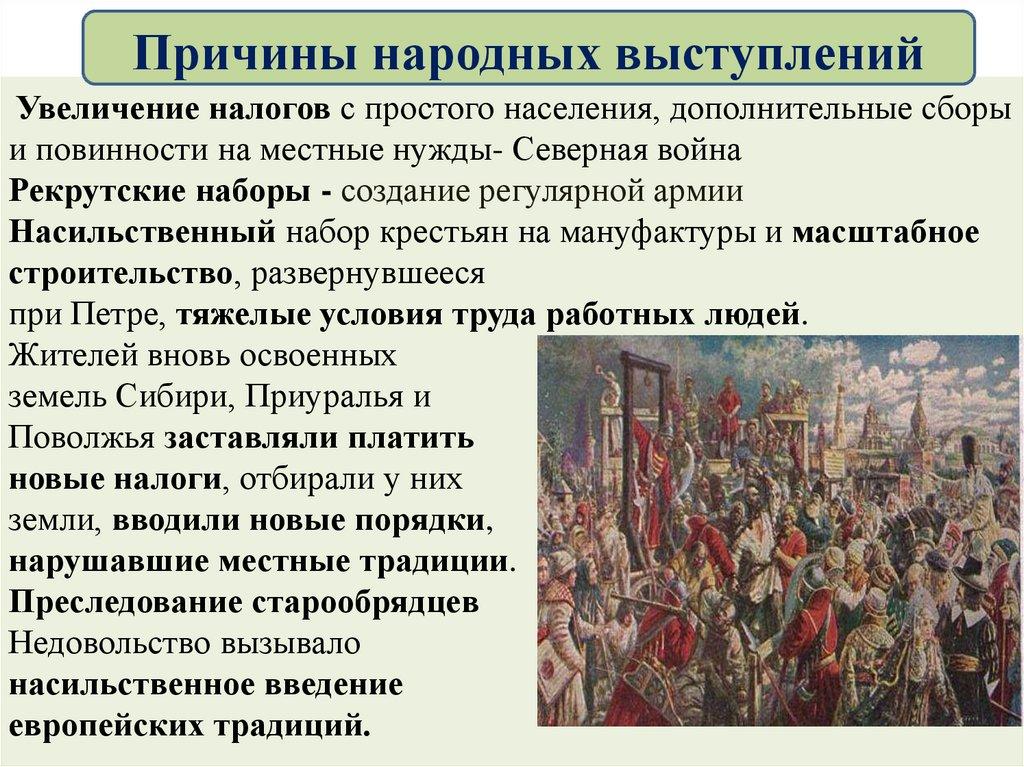 Причины народных выступленийУвеличение налогов с простого населения, дополнительные сборы