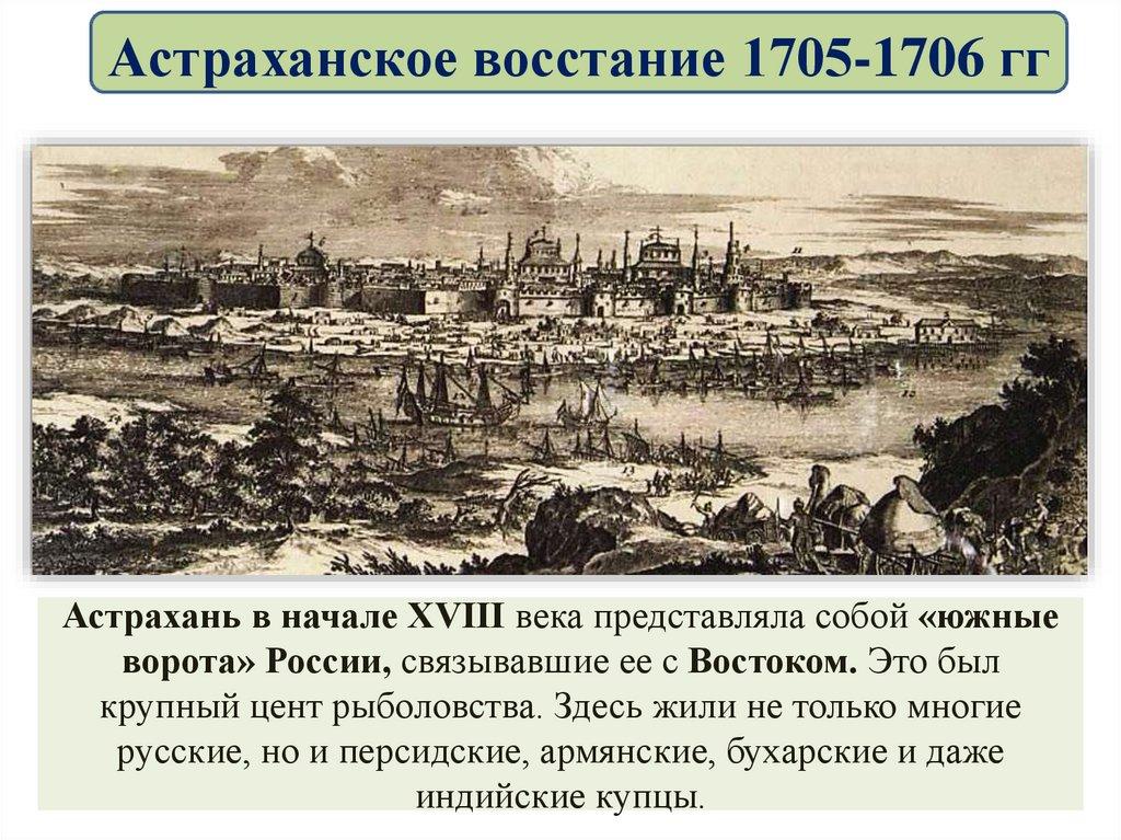 Астраханское восстание 1705-1706 ггАстрахань в начале XVIII века представляла собой «южные