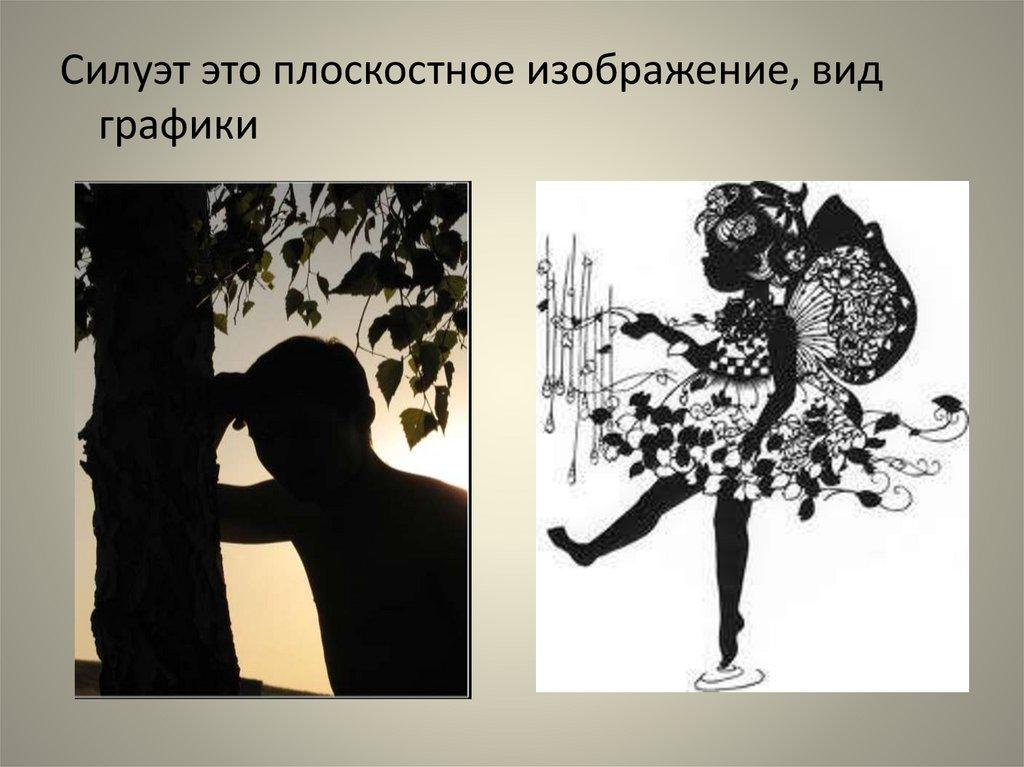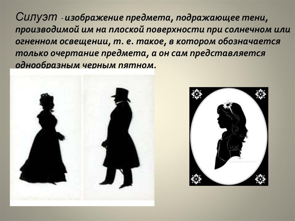 Силуэт - изображение предмета, подражающее тени,производимой им на плоской поверхности при солнечном или