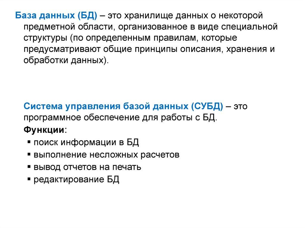 База данных (БД) – это хранилище данных о некоторойпредметной области, организованное в виде специальной