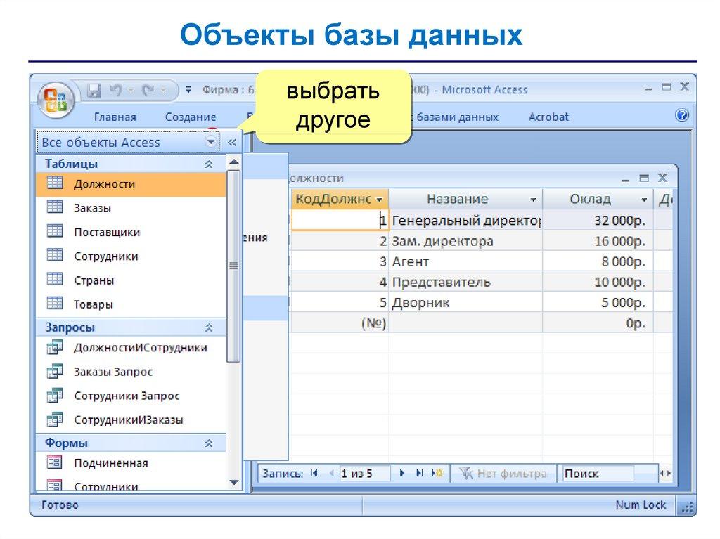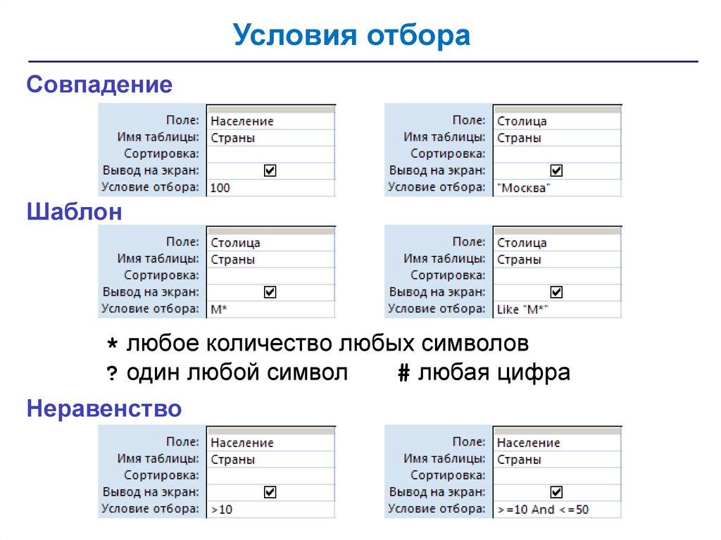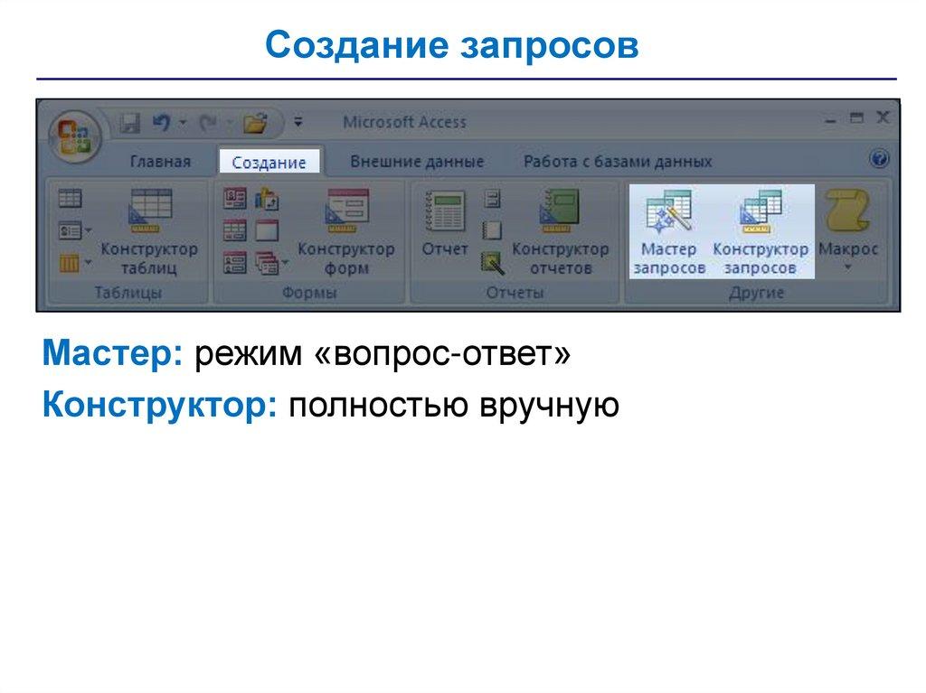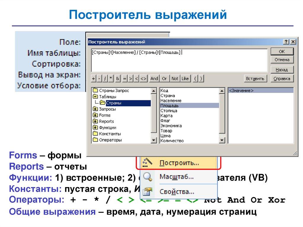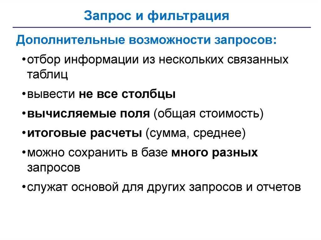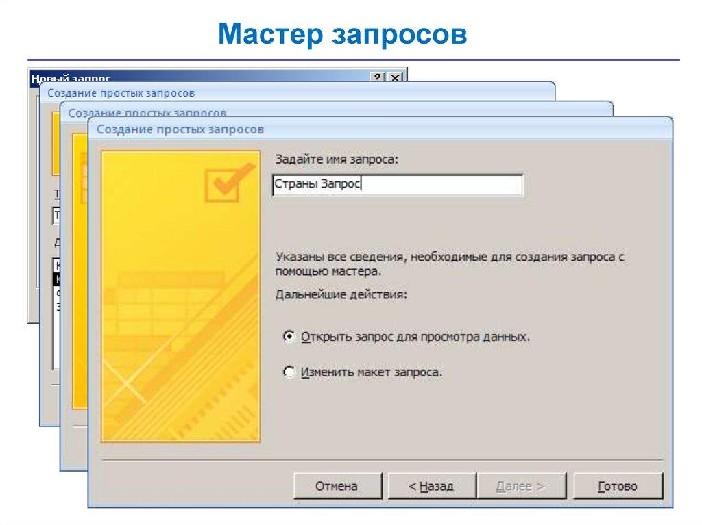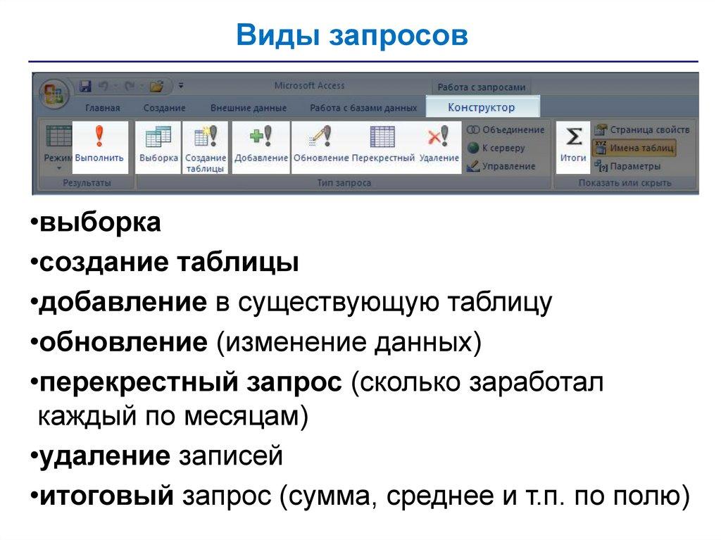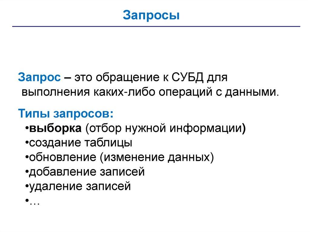 • запросы – обращения к базе данных для выбора