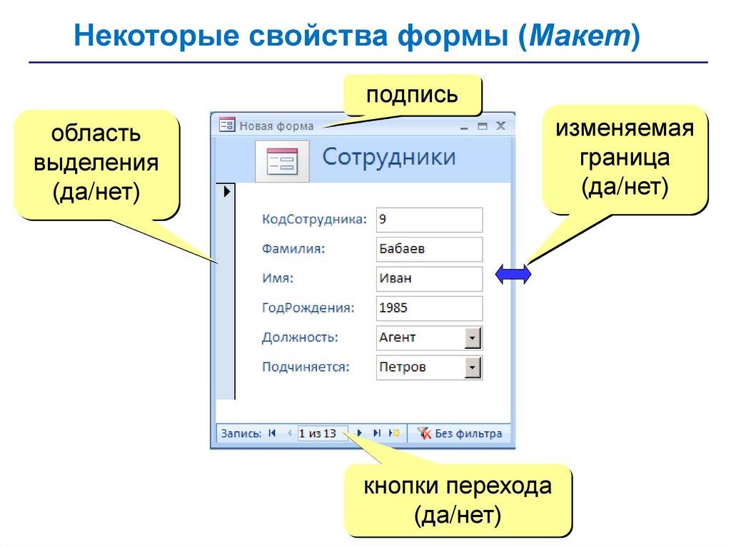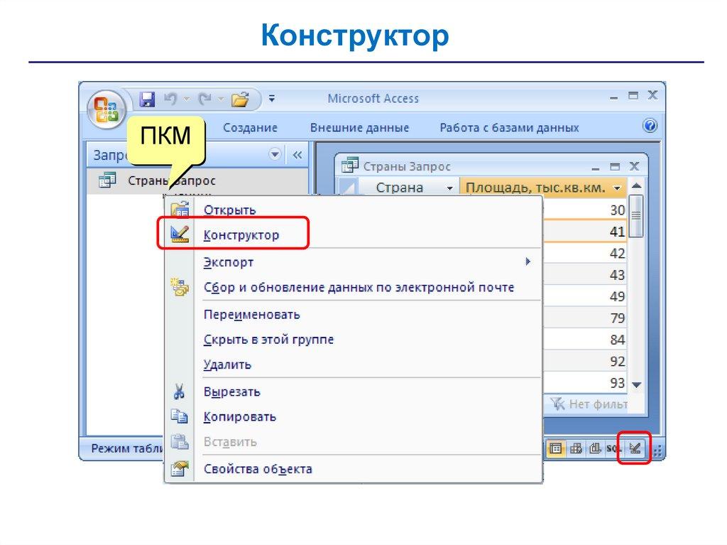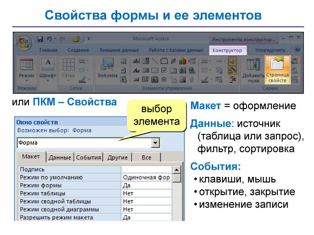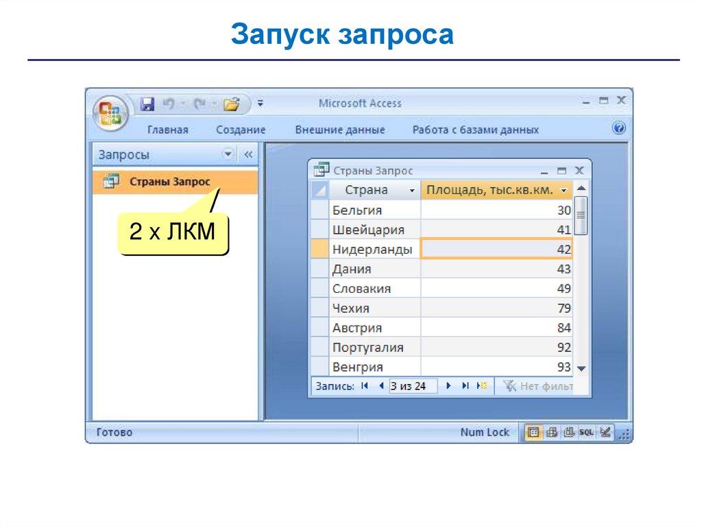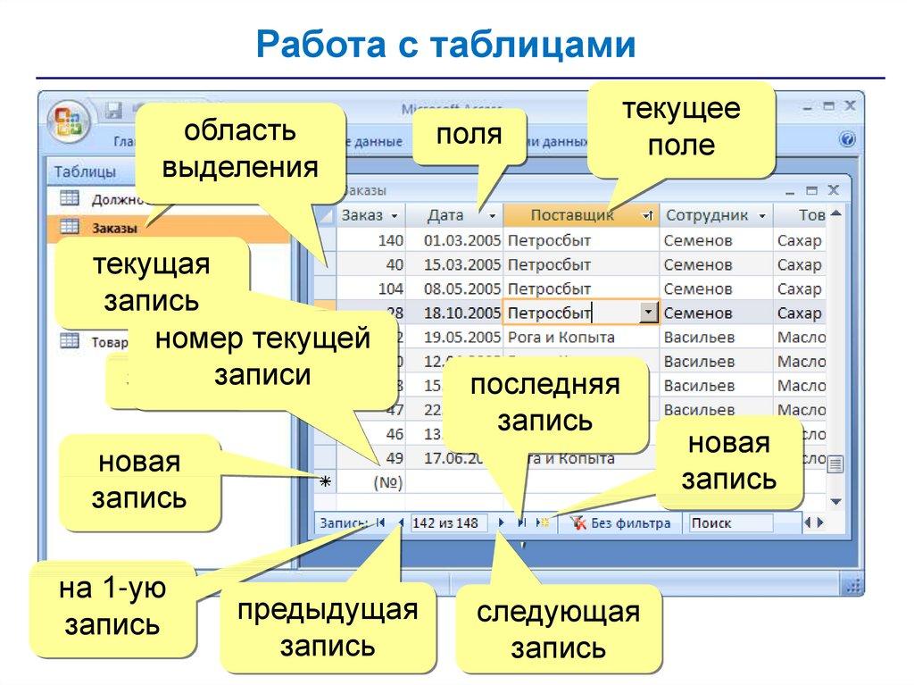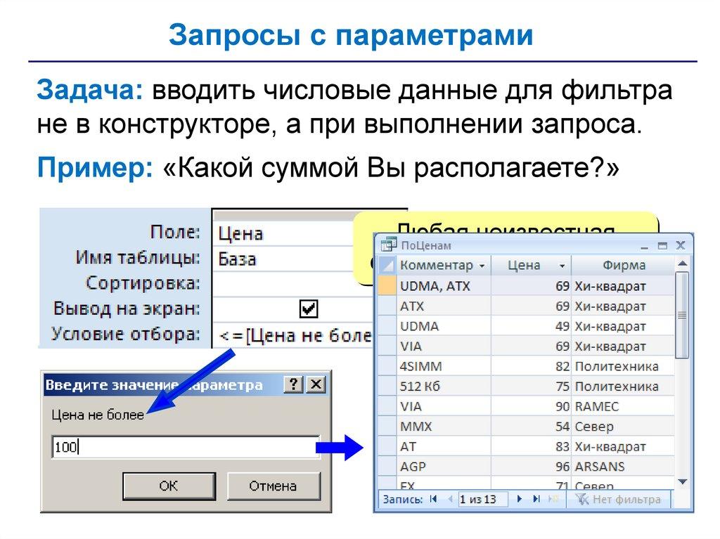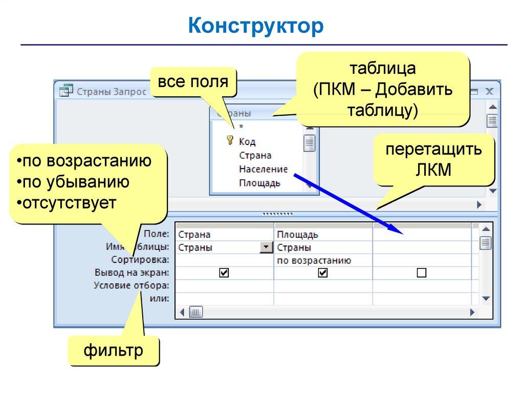 • запросы – обращения к базе данных для выбора