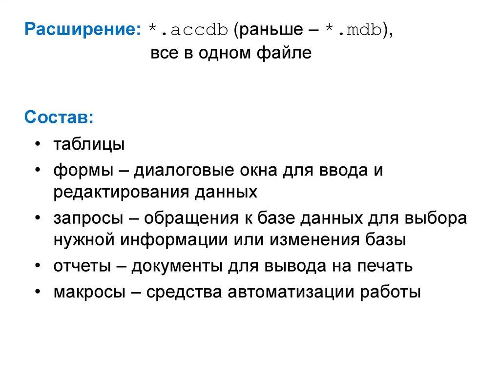 Расширение: *.accdb (раньше – *.mdb),все в одном файле