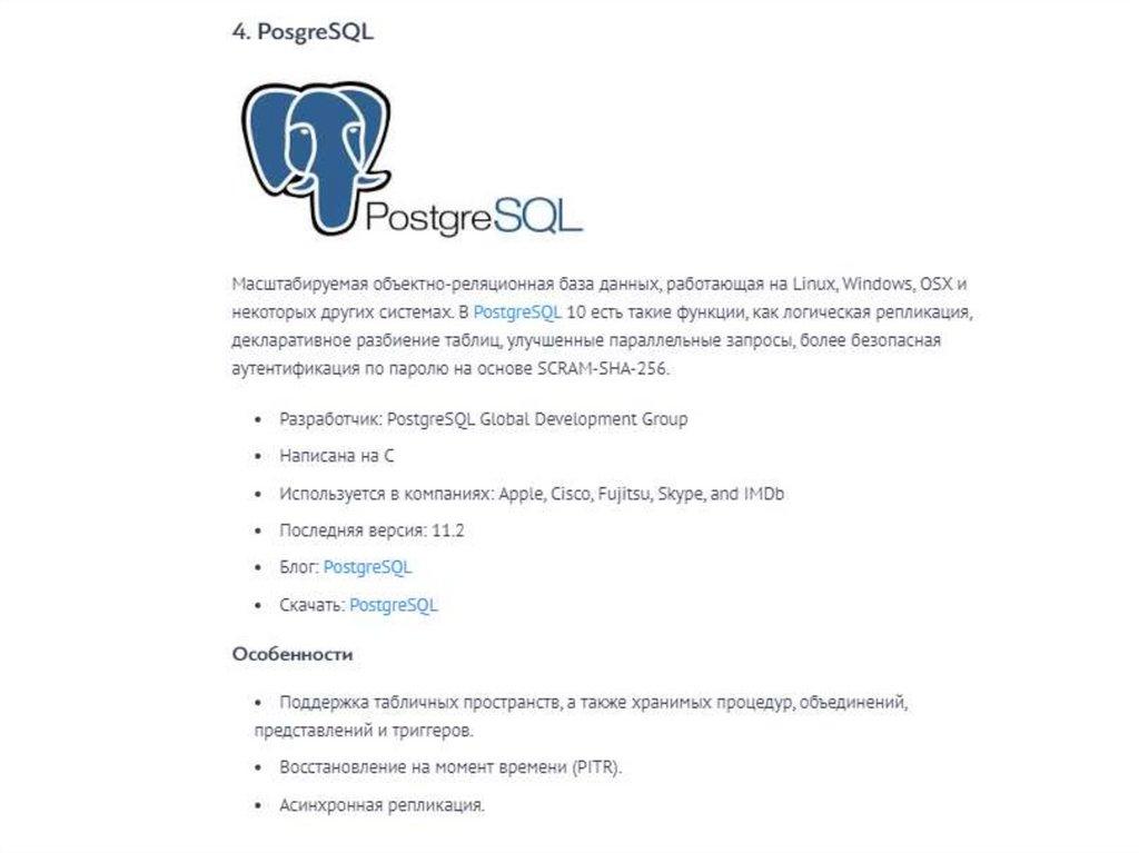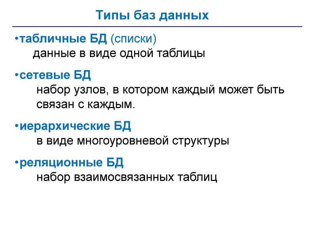 Типы баз данных•табличные БД (списки)