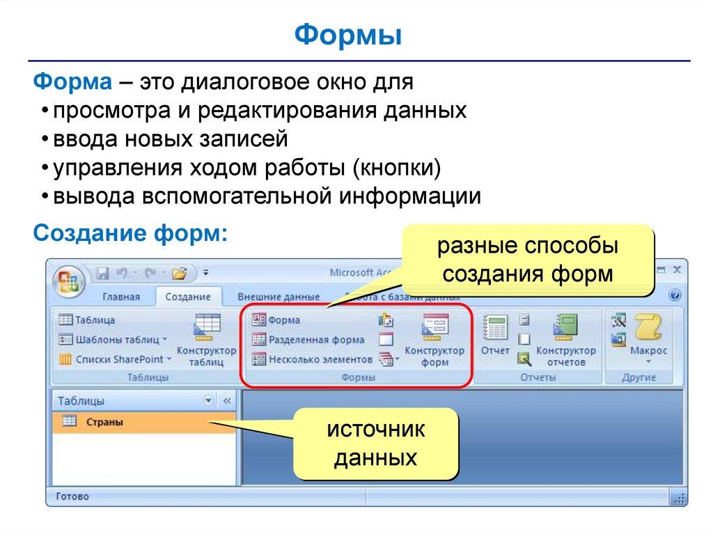• формы – диалоговые окна для ввода и