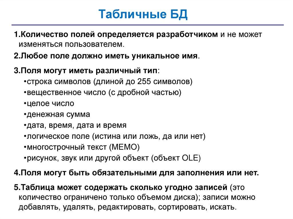 Табличные БД1.Количество полей определяется разработчиком и не может