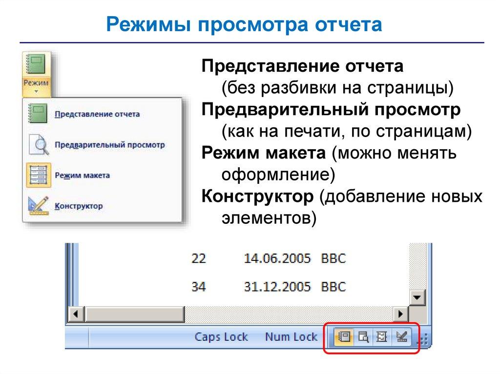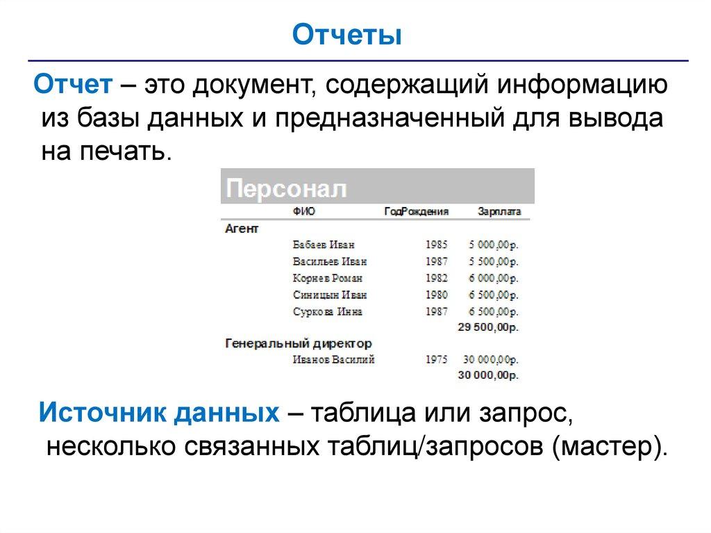 • отчеты – документы для вывода на печать