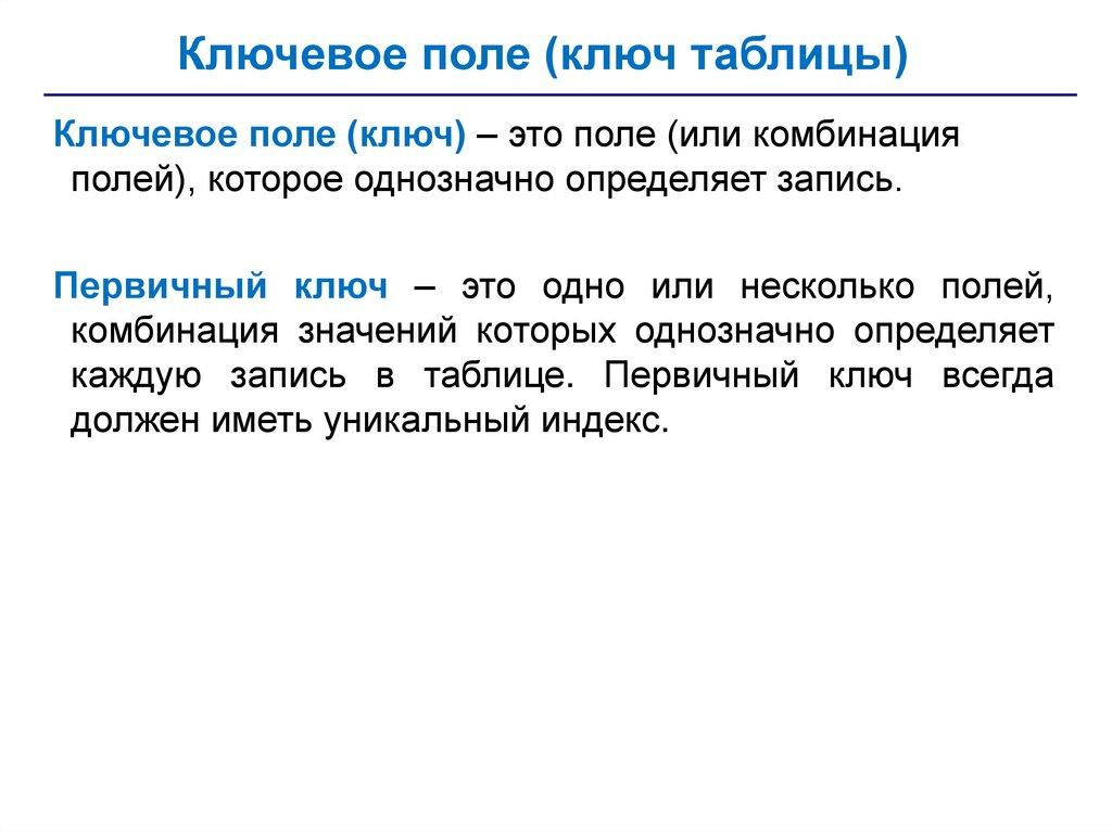 Ключевое поле (ключ таблицы)Ключевое поле (ключ) – это поле (или комбинация