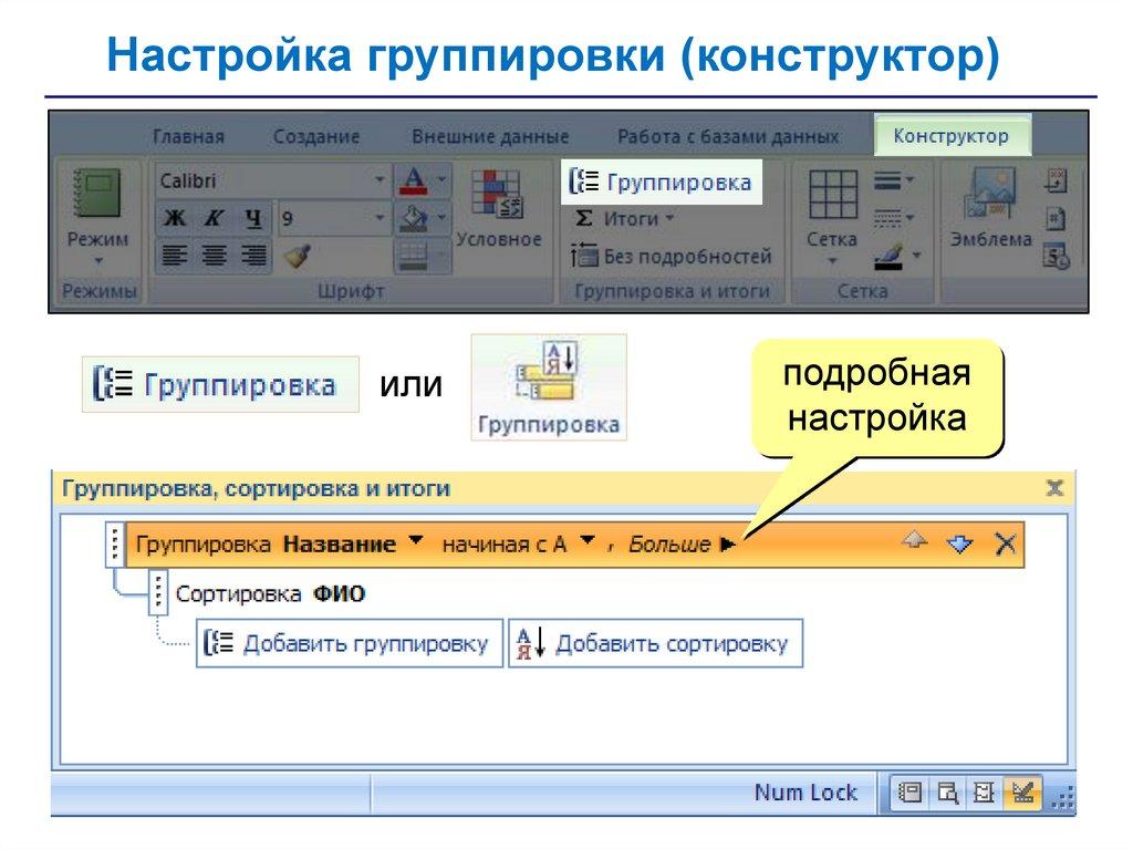 Настройка группировки (конструктор)или