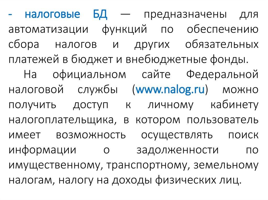 - налоговые БД — предназначены дляавтоматизации функций по обеспечению