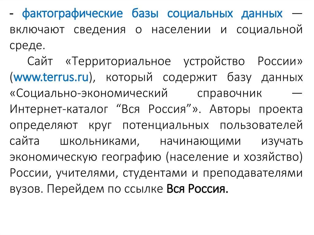 - фактографические базы социальных данных —включают сведения о населении и социальной