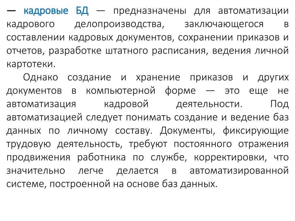 — кадровые БД — предназначены для автоматизациикадрового