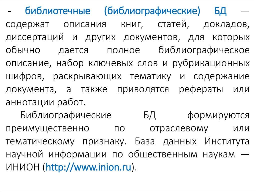 - библиотечные (библиографические) БД —содержат описания книг, статей, докладов,