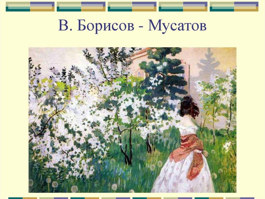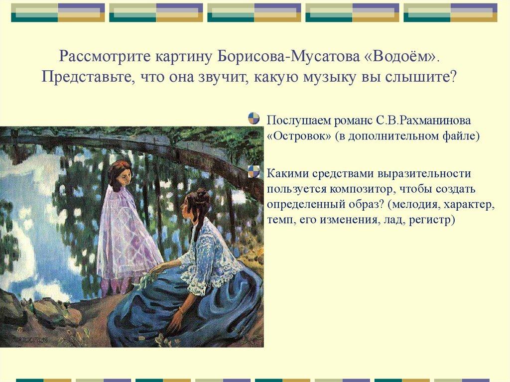 Рассмотрите картину Борисова-Мусатова «Водоём».Представьте, что она звучит, какую музыку вы слышите?