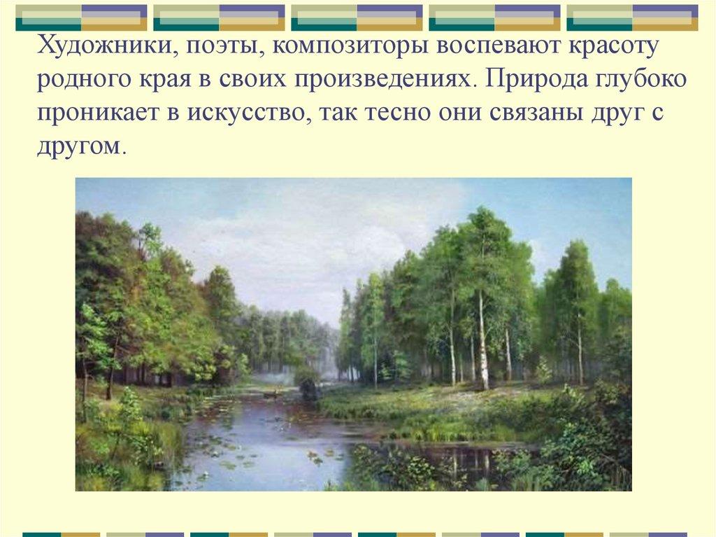 Художники, поэты, композиторы воспевают красотуродного края в своих произведениях. Природа глубоко