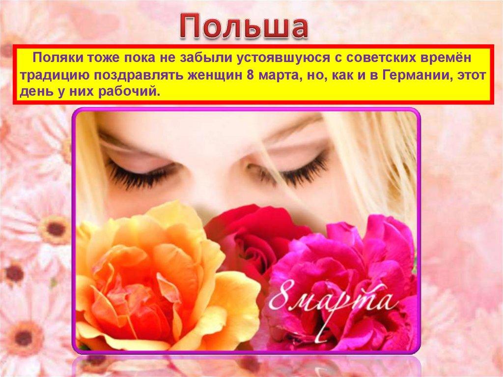 Поляки тоже пока не забыли устоявшуюся с советских времёнтрадицию поздравлять женщин 8 марта, но, как и в Германии, этот