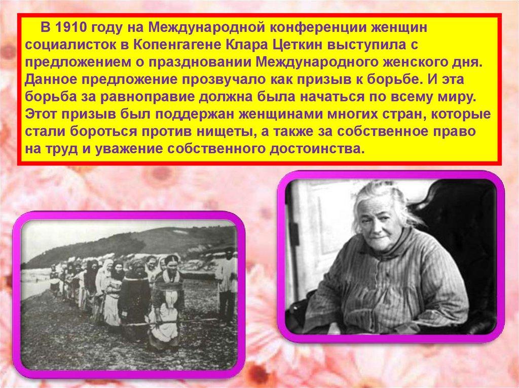 В 1910 году на Международной конференции женщинсоциалисток в Копенгагене Клара Цеткин выступила с