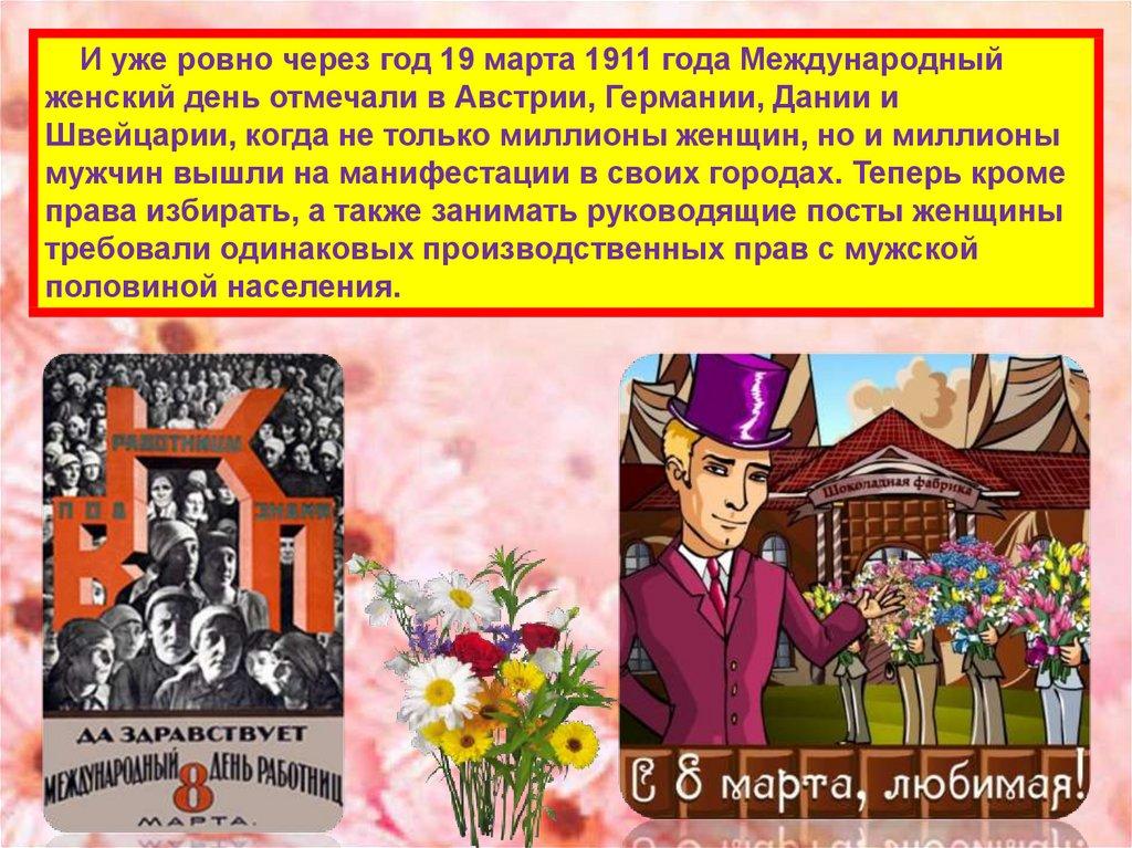 И уже ровно через год 19 марта 1911 года Международныйженский день отмечали в Австрии, Германии, Дании и
