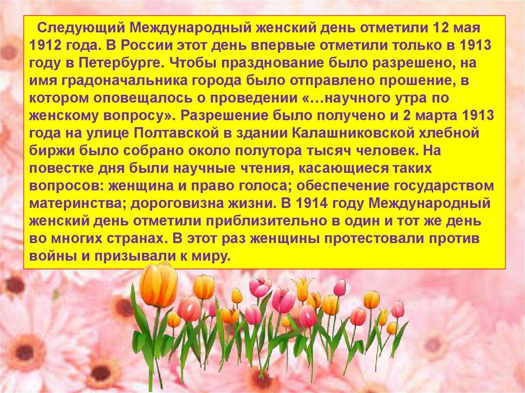 Следующий Международный женский день отметили 12 мая1912 года. В России этот день впервые отметили только в 1913