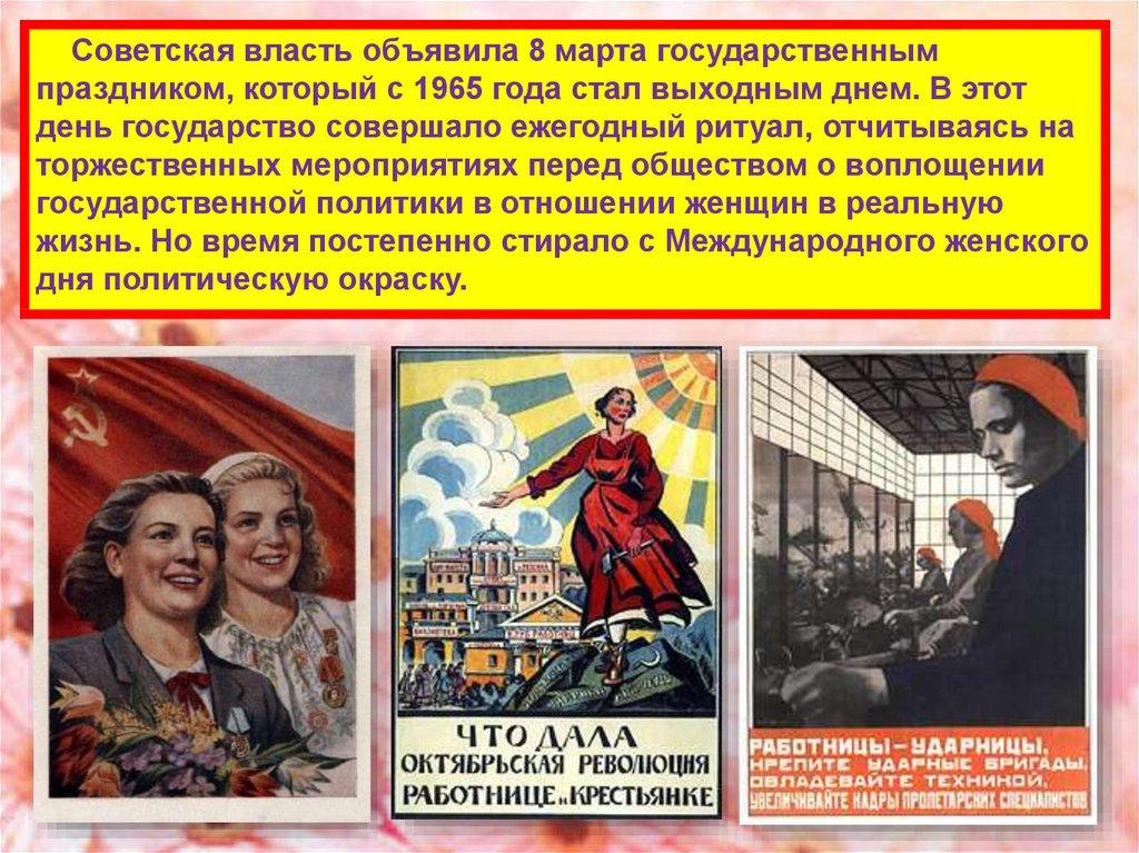 Советская власть объявила 8 марта государственнымпраздником, который с 1965 года стал выходным днем. В этот