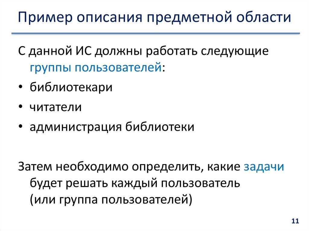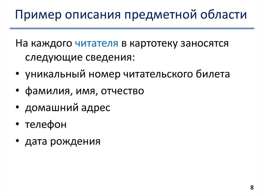 Пример описания предметной областиНа каждого читателя в картотеку заносятся