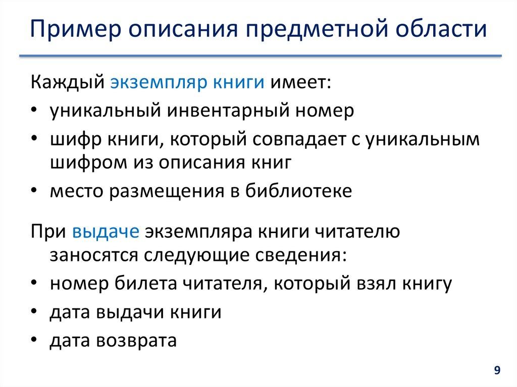 Пример описания предметной областиКаждый экземпляр книги имеет: