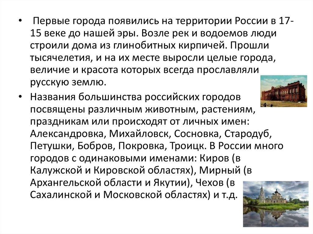 • Первые города появились на территории России в 1715 веке до нашей эры. Возле рек и водоемов людистроили дома из глинобитных кирпичей. Прошли