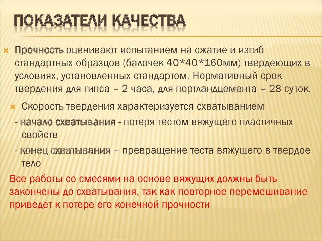 ПОКАЗАТЕЛИ КАЧЕСТВАПрочность оценивают испытанием на сжатие и изгиб