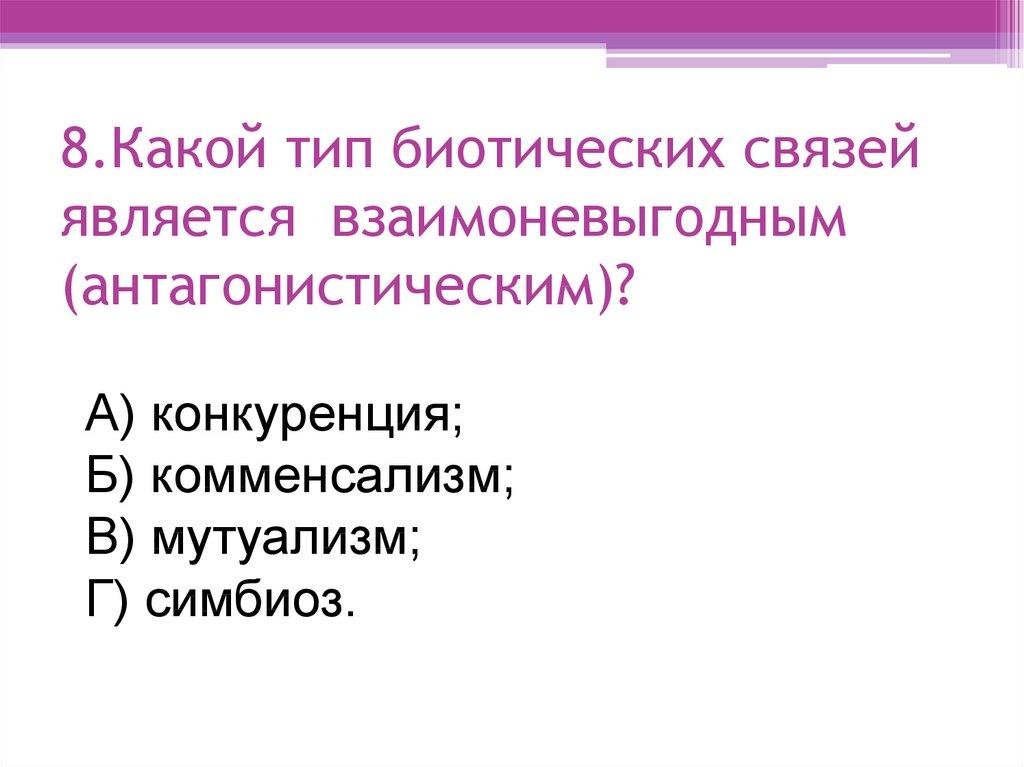 30. 8.Какой тип биотических связей является взаимоневыгодным (антагонистическим)?