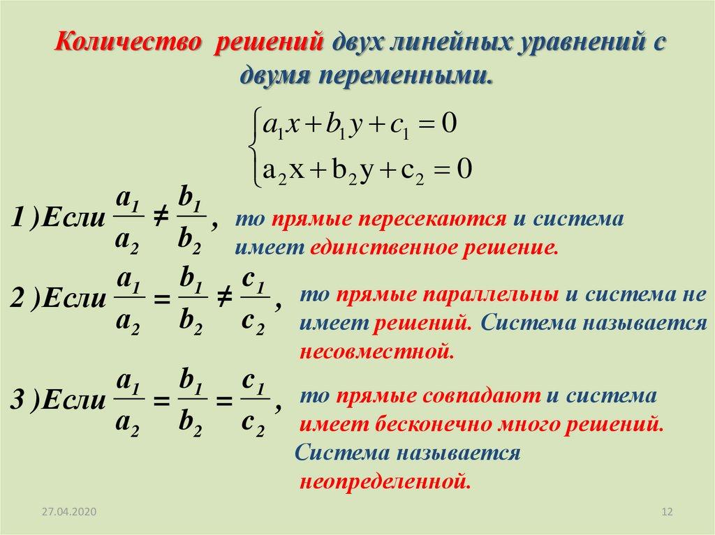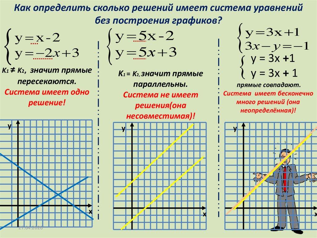 Как определить сколько решений имеет система уравненийбез построения графиков?