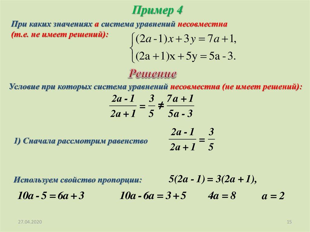 Пример 4При каких значениях а система уравнений несовместна