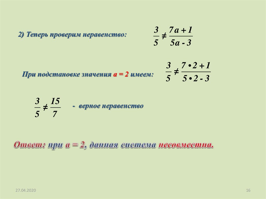 2) Теперь проверим неравенство:При подстановке значения а = 2 имеем: