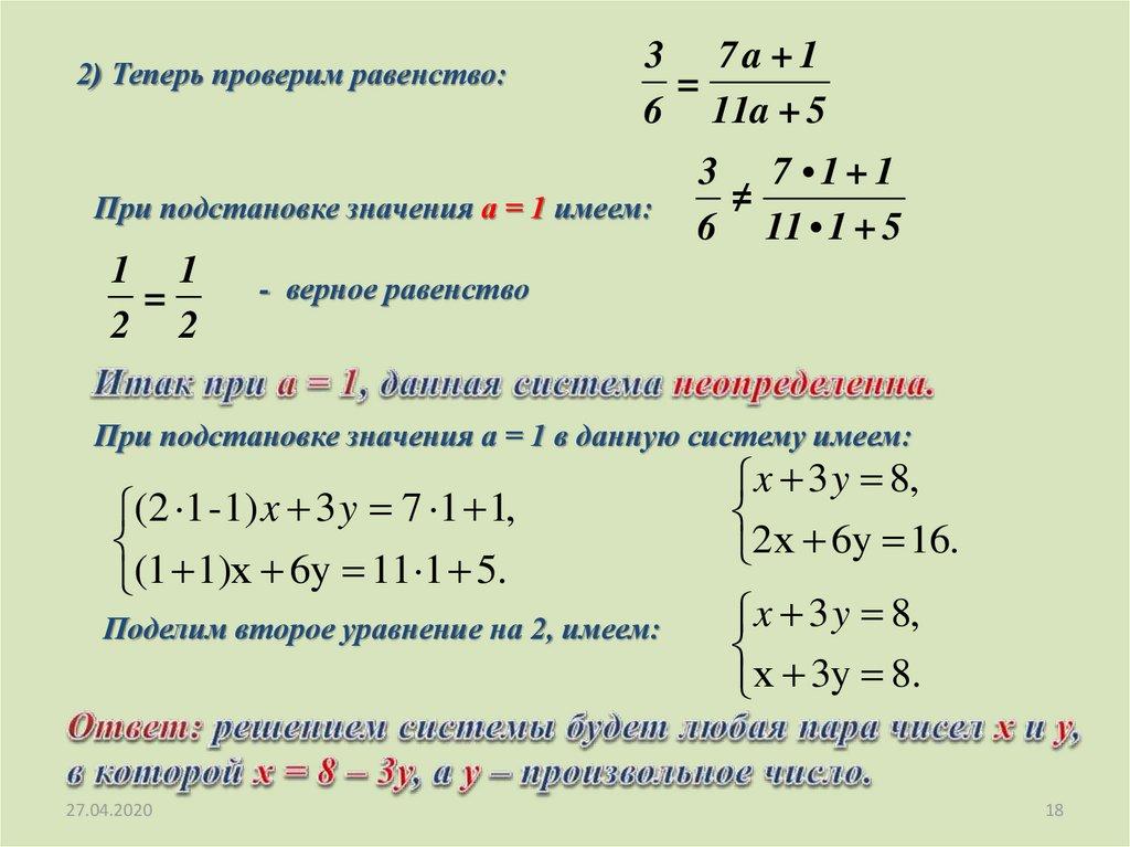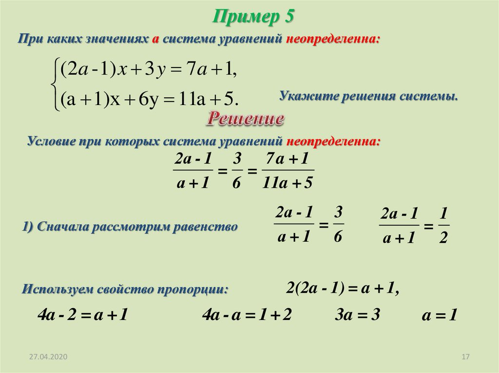 Пример 5При каких значениях а система уравнений неопределенна: