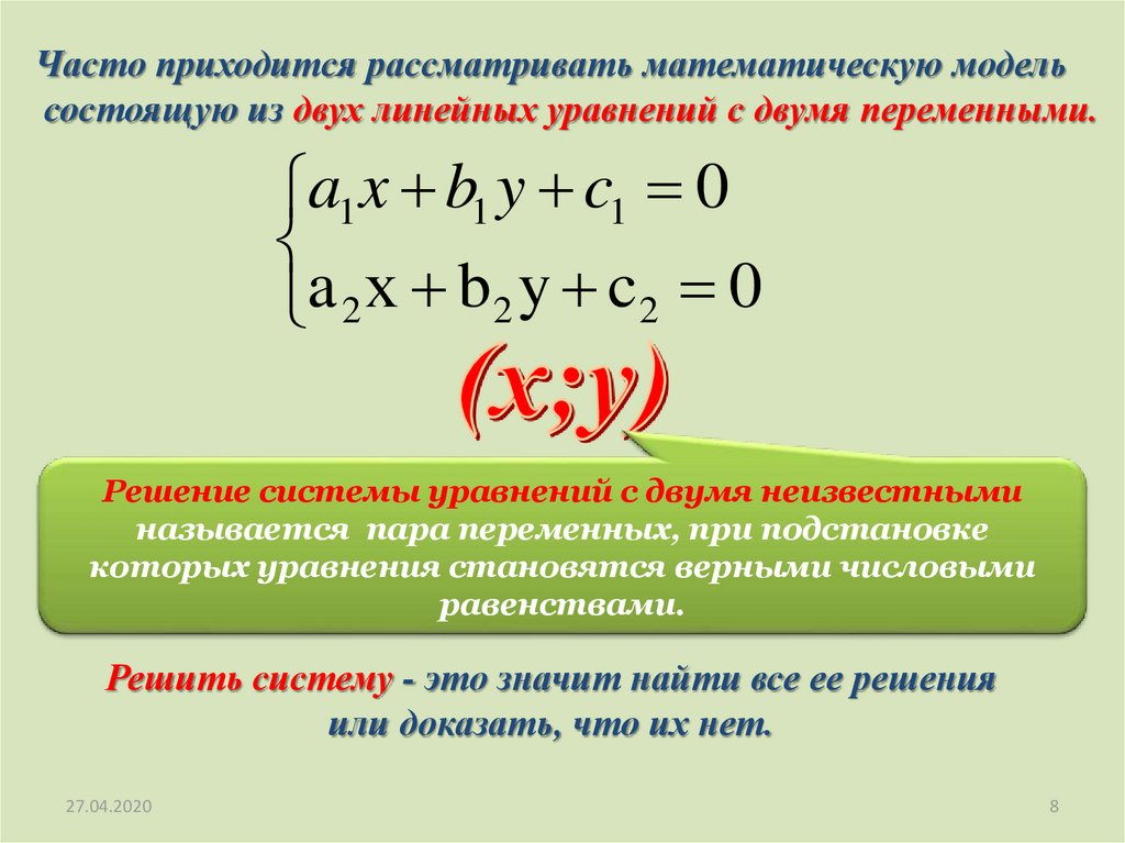 Часто приходится рассматривать математическую модельсостоящую из двух линейных уравнений с двумя переменными.