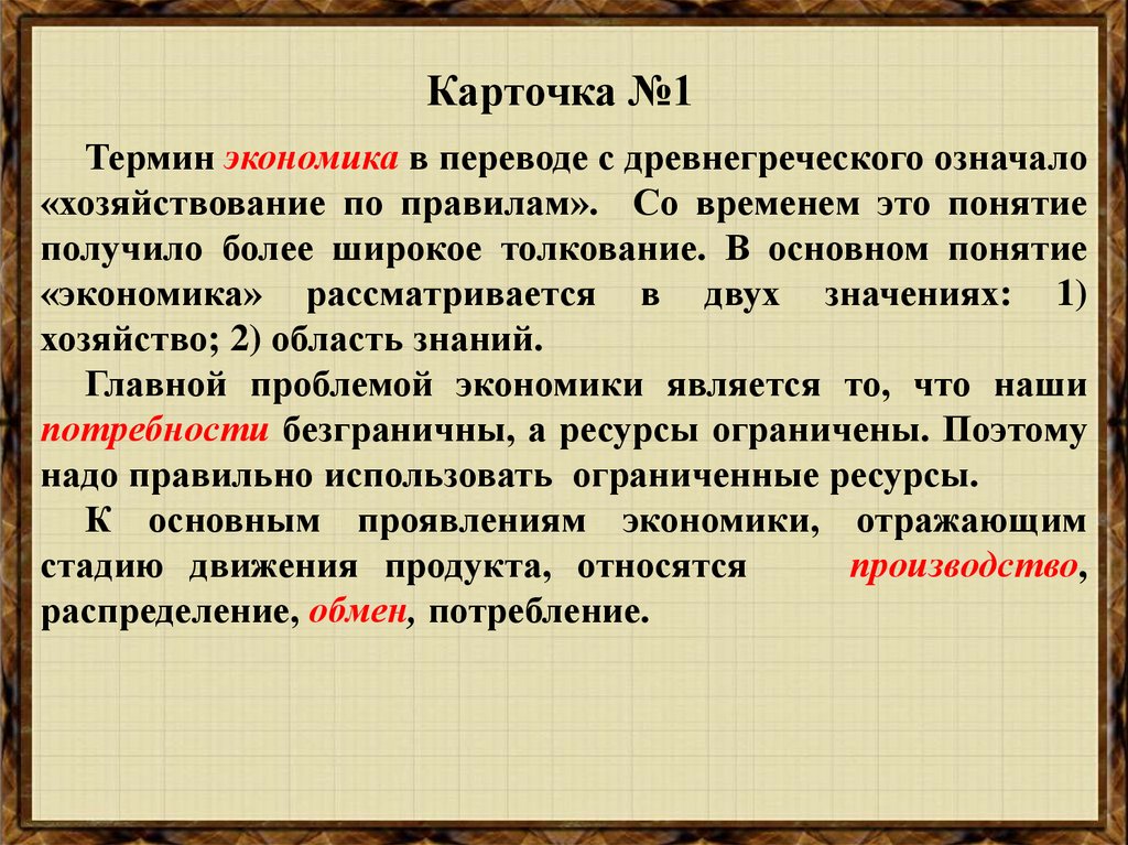 Карточка №1Термин экономика в переводе с древнегреческого означало