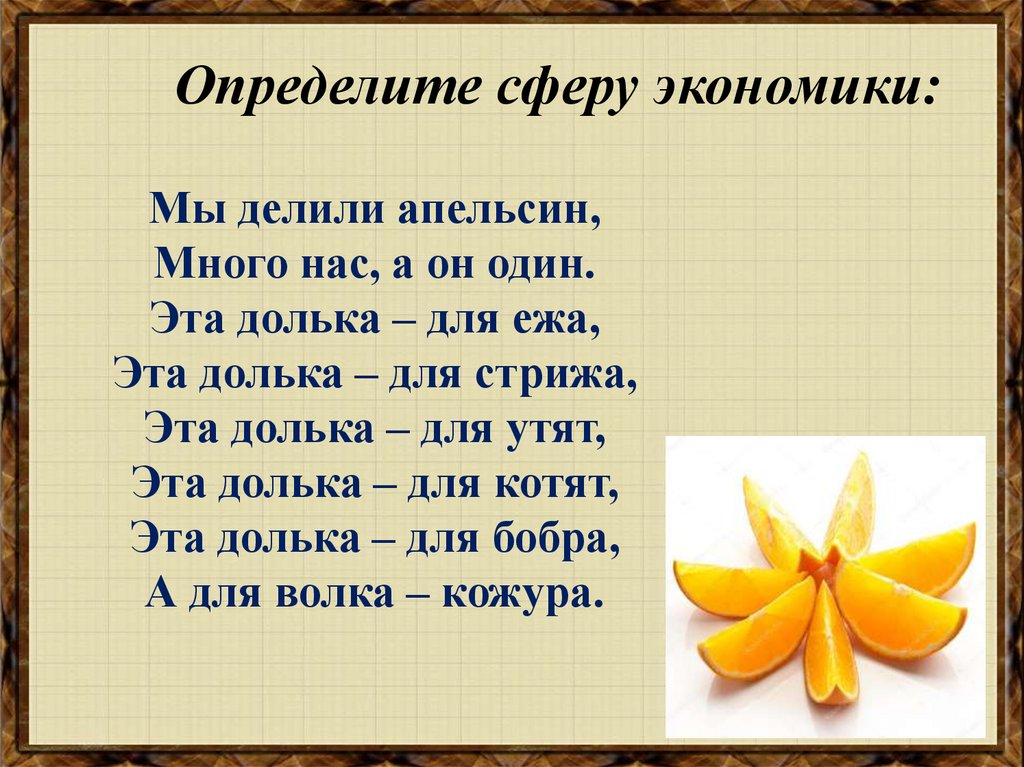 Определите сферу экономики:Мы делили апельсин,