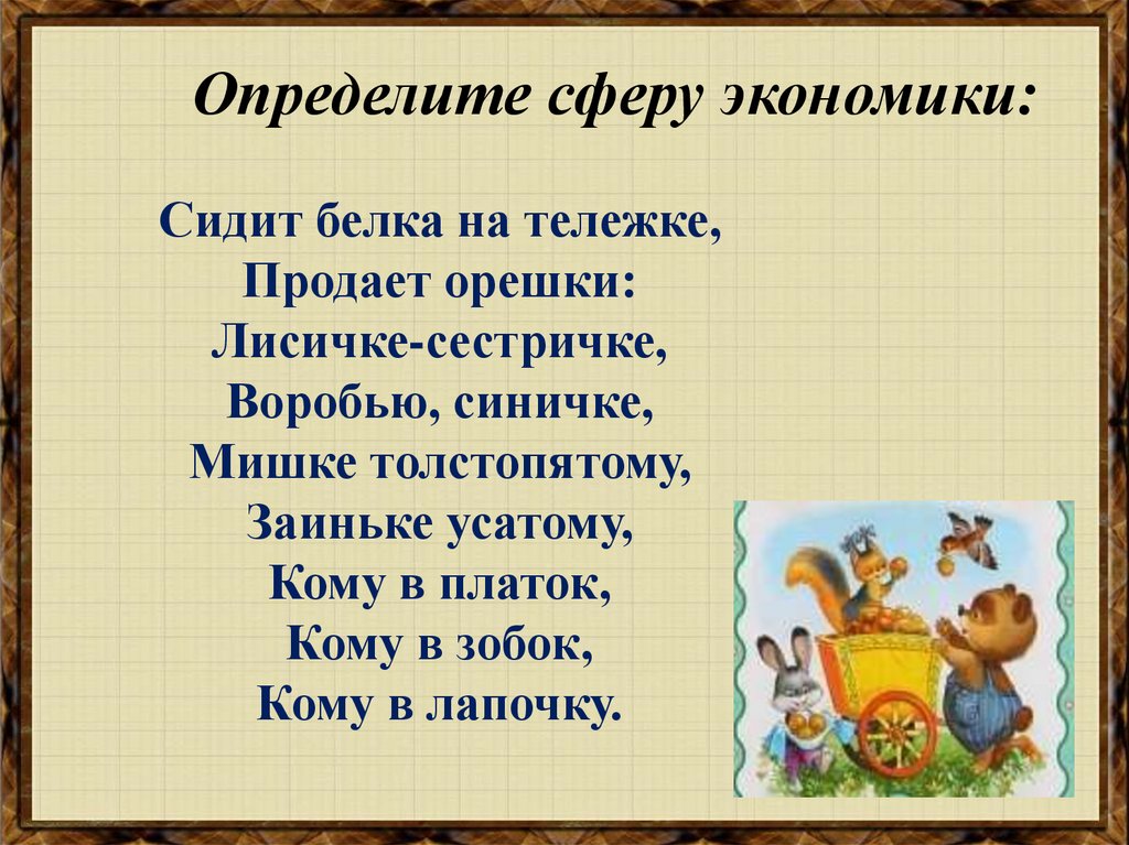 Определите сферу экономики:Сидит белка на тележке,