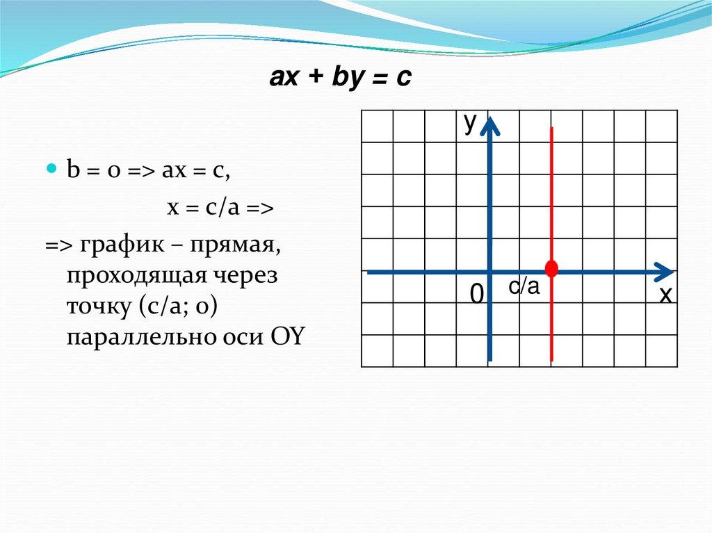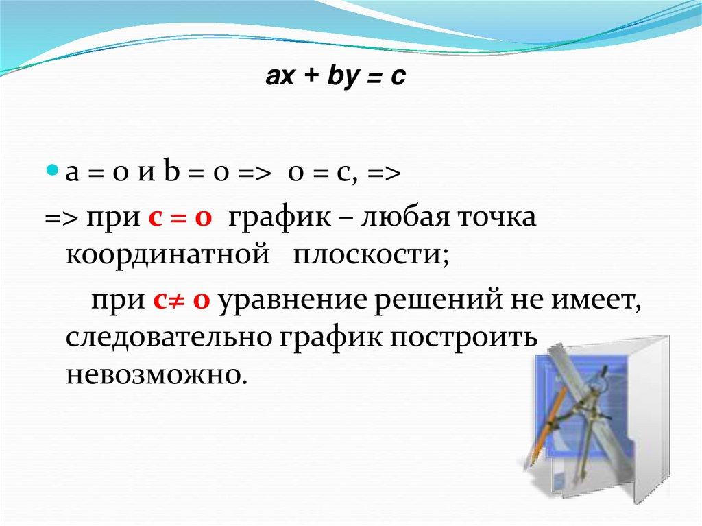 aх + by = cа = 0 и b = 0 => 0 = c, =>