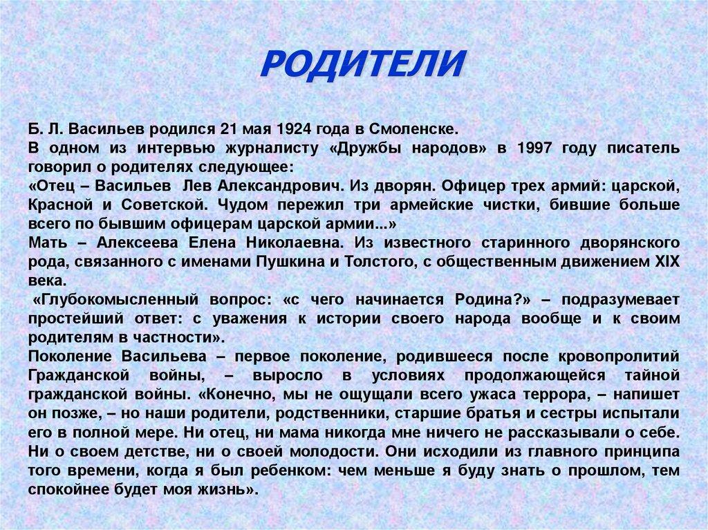 РОДИТЕЛИБ. Л. Васильев родился 21 мая 1924 года в Смоленске.