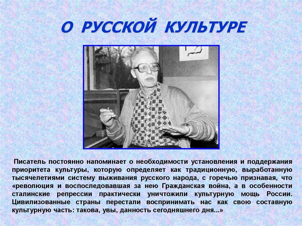 О РУССКОЙ КУЛЬТУРЕПисатель постоянно напоминает о необходимости установления и поддержания