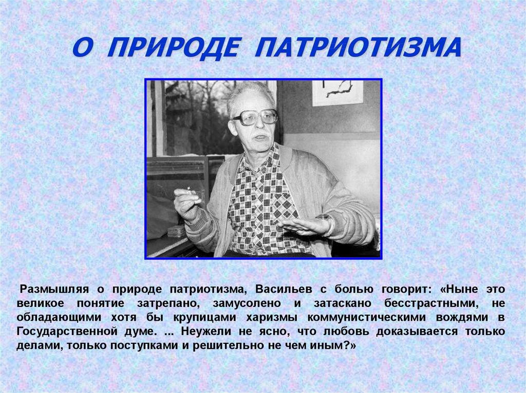 О ПРИРОДЕ ПАТРИОТИЗМАРазмышляя о природе патриотизма, Васильев с болью говорит: «Ныне это