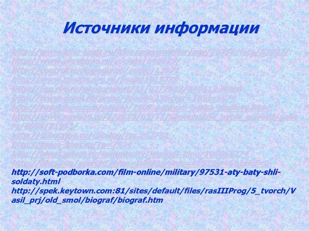 Источники информацииhttp://www.kino-teatr.ru/kino/screenwriter/sov/28758/foto/53923/
