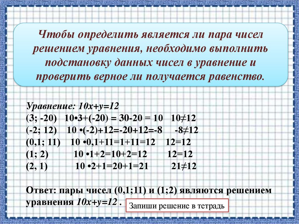 уравнения 10x+y=12 . Запиши решение в тетрадь