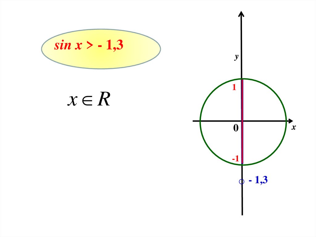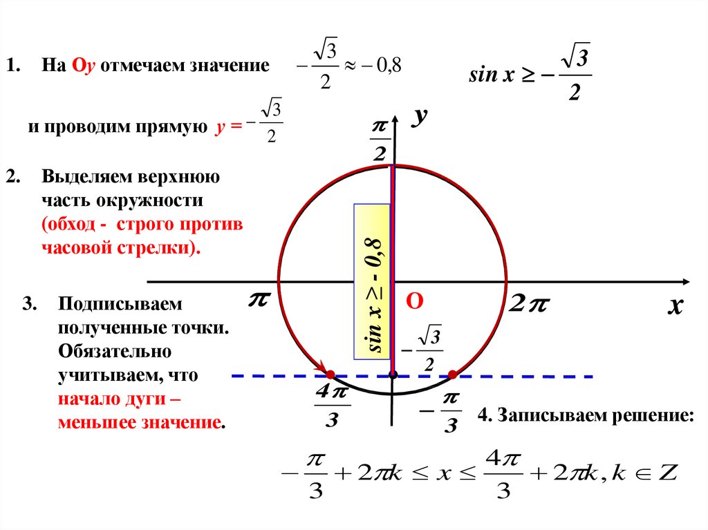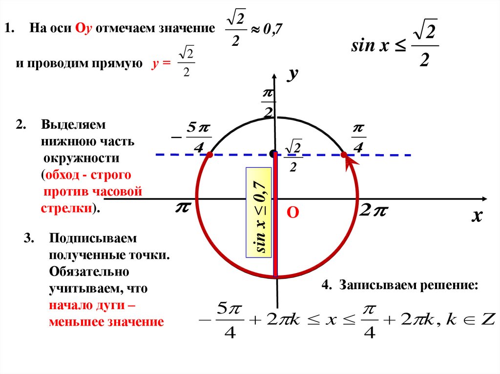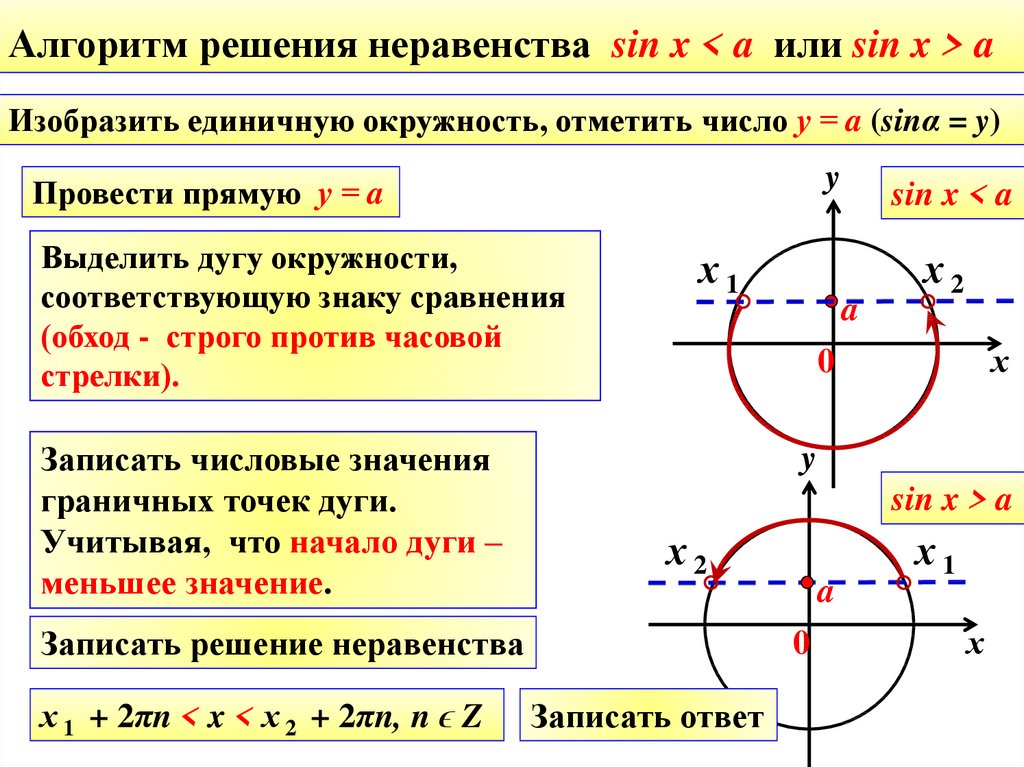 Алгоритм решения неравенства sin x < a или sin x > aИзобразить единичную окружность, отметить число у = a (sinα = y)